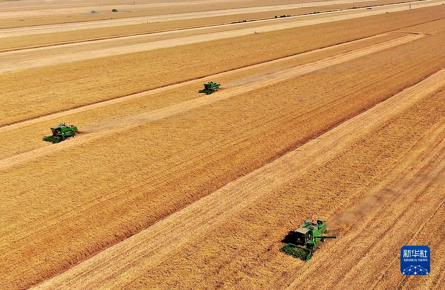 在河南省黃泛區農場九分場的麥田里,農機手操作收割機收獲小麥(無人機照片,6月6日攝)。新華社記者 李安 攝