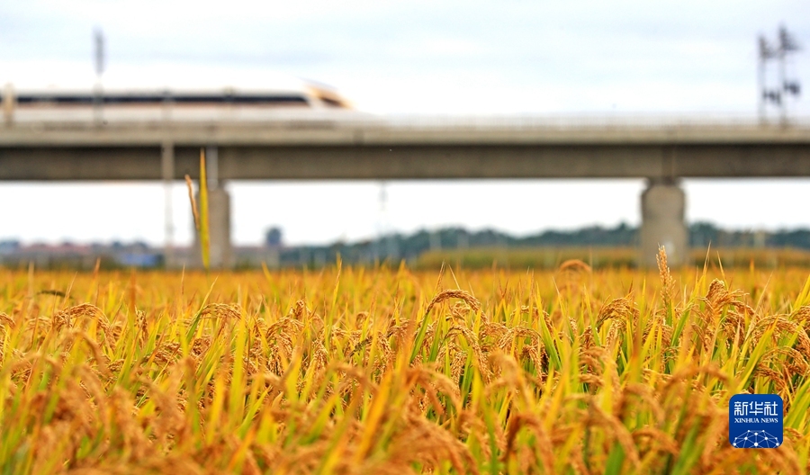 9月22日,在遼寧省鐵嶺縣腰堡鎮,高鐵列車從金色的稻田旁經過。新華社記者 楊青 攝