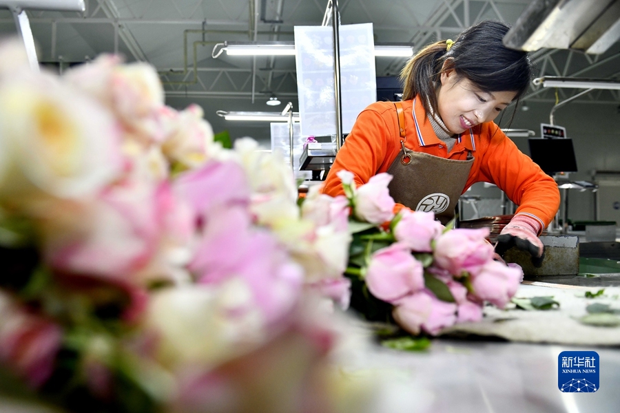 12月17日,在山東省莒縣招賢曲坊現代農業產業園玫瑰基地,工作人員在包裝玫瑰。新華社記者 郭緒雷 攝