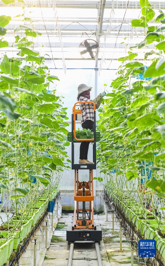 9月22日,在海南省陵水現代農業示范基地,工人為黃瓜苗吊蔓。新華社記者 周佳誼 攝