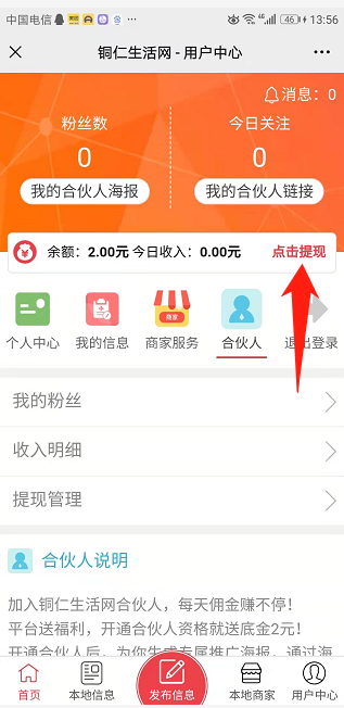 如何開通合伙人直接登錄你的賬號,沒有賬號也可以直接使用微信登錄點擊合伙人點擊開通合伙人開通后直接送2元底金如何賺傭金點擊我的合伙人海報,把海報保存到手機,分享到朋友圈或好友好友掃碼(長按識別二維碼)關